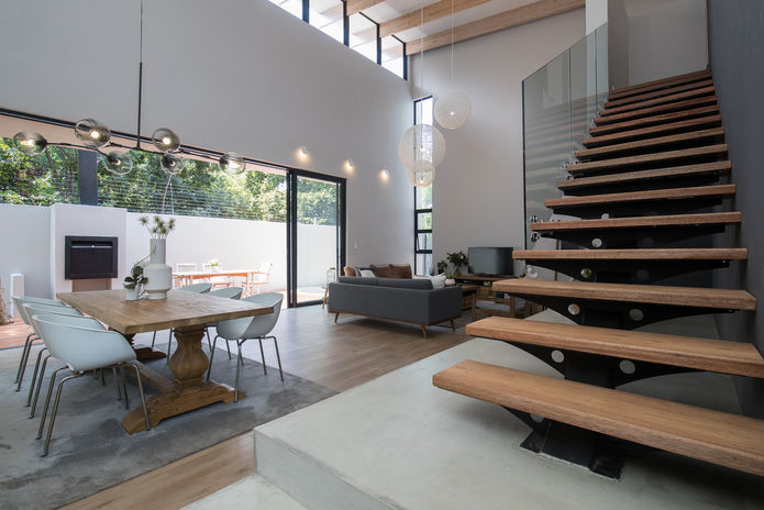 Situated in one of the most established neighbourhoods of Pretoria - this development focus to attract a new market group in the area. It has been the norm in South Africa to create isolated suburban pockets which do not allow for integrated housing models. These new housing typologies challenge this notion by introducing a higher density to the suburb. The housing units were designed to take full advantage of the 500 sqm plots by clever design and planning. The units are orientated directly North allowing generous natural light into the double volume living space and kitchen. A long European style courtyard opens up into an outside space with a floating pergoa, built in braai and a fire pit sunken into the timber deck. The garden is planted with endemic species which flows into the courtyard and controls the temperature of the outside living spaces. The rooms open up onto northern balconieswhich overlook the canopies of trees surrounding the suburb.